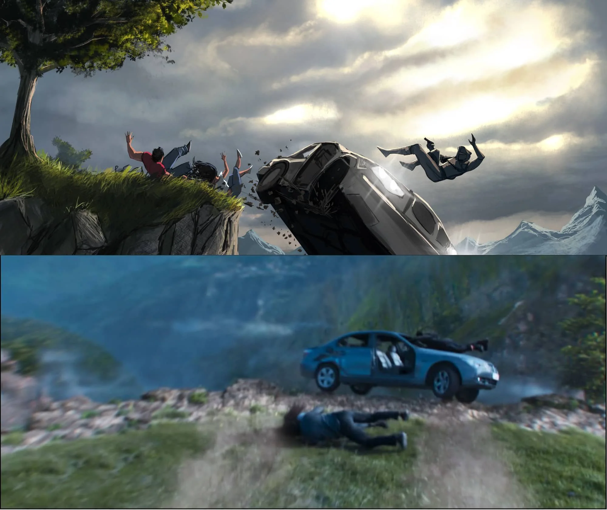 This is an example of designing effects after the scene has been shot. I painted over the filmed footage to give the VFX artists a guide to the look and pacing of a scene.